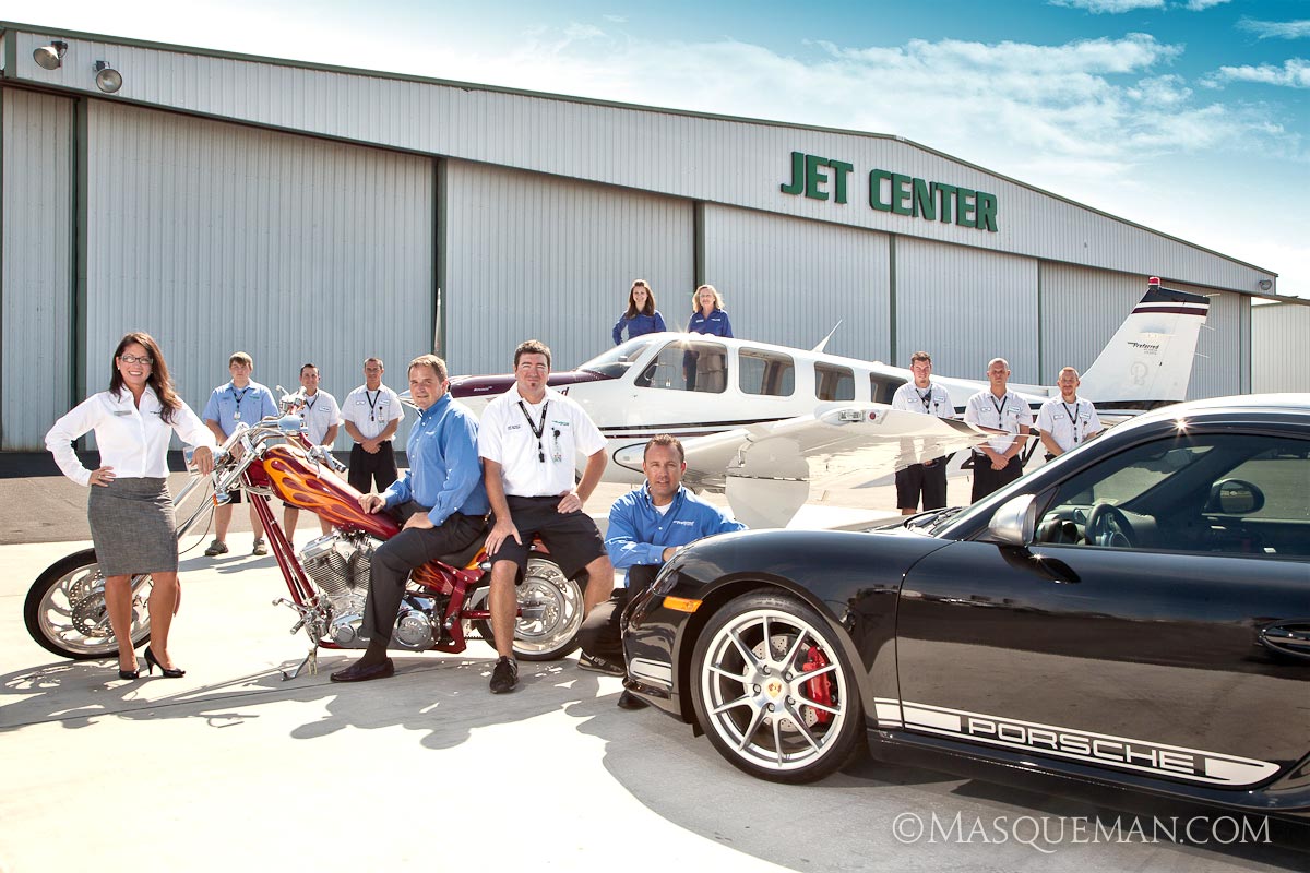 If you think moving people around in regular group photo is tough, try adding 12 people, a multi-million dollar aircraft, a gasoline tanker and a sports car into the mix. From atop of an aircraft tug, I looked through my lens as workers moved the elements into place. I would pass instructions to my client who would yell them out and use hand gestures. I was about to pull my hair out when it all came together. I was literally asking to move the jet back and forth by an inch or two, and it was surprising to see how much that could make the difference.
