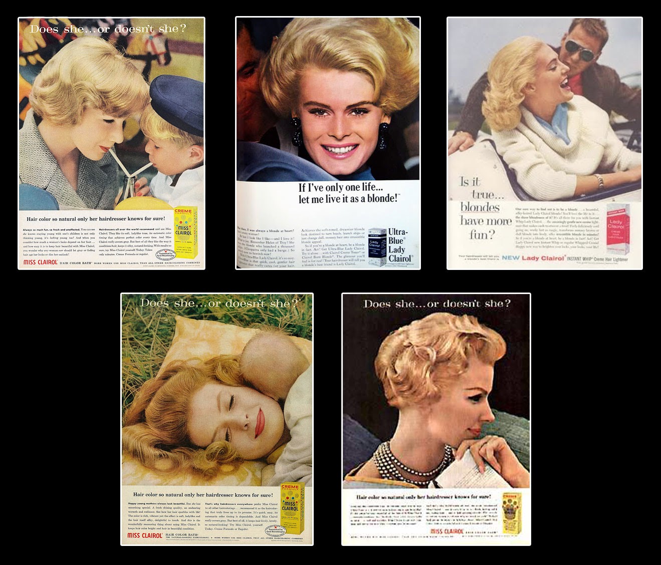 What IS known is that an astute woman named Shirley Polykoff solidified that concept into the collective of modern pop culture. Working for the ad agency responsible for the Clairol hair product accounts, she came up with these golden slogans for the company: