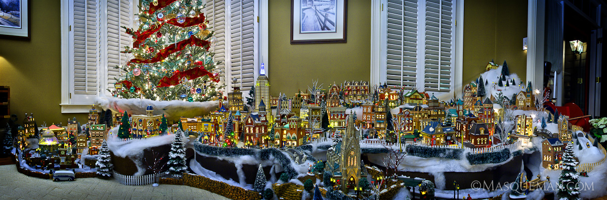 My task was to photograph the display while maintaining the candle light charm of the city. It would not do any good to set up flashes that over power the ambiance of thousands of tiny lights. Each lamp in the display tended to illuminate the immediate surrounding areas in tiny pools of light… just like in real life. The Christmas tree in the background actually snowed… I know it’s hard to believe… Just go with me on this…