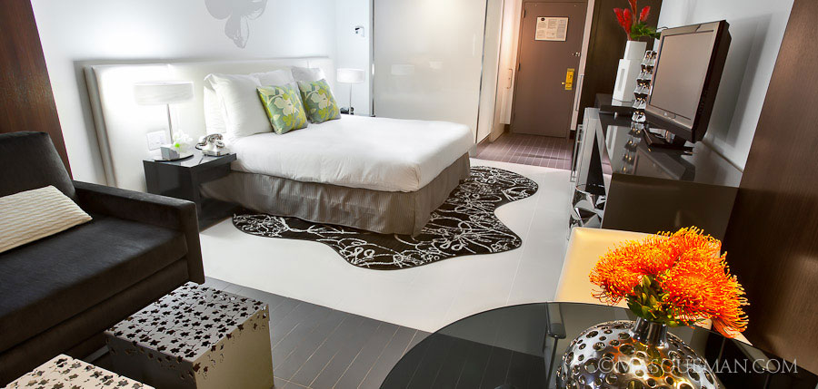 I also took photos of the room next door which was more of a standard hotel room. It’s pretty interesting to see the difference between the two. This room had the gauze-like sheer curtain that would have helped tame the other room’s extreme lighting conditions. Oh well.