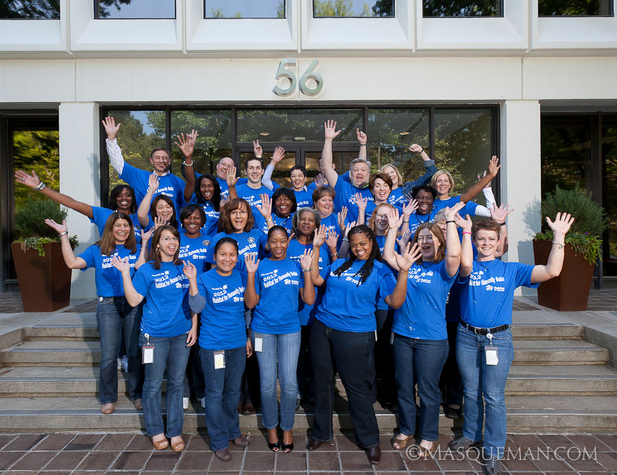 Last week I made a deceptively simple group photo for an Atlanta insurance company who had participated in Habitat for Humanity. I think 80% of the company helped build a house. Impressive. The day before the portrait, my boss took an iphone snapshot of the location. I could tell it was going to be relatively dak because we were shooting on the shadow side of the building.